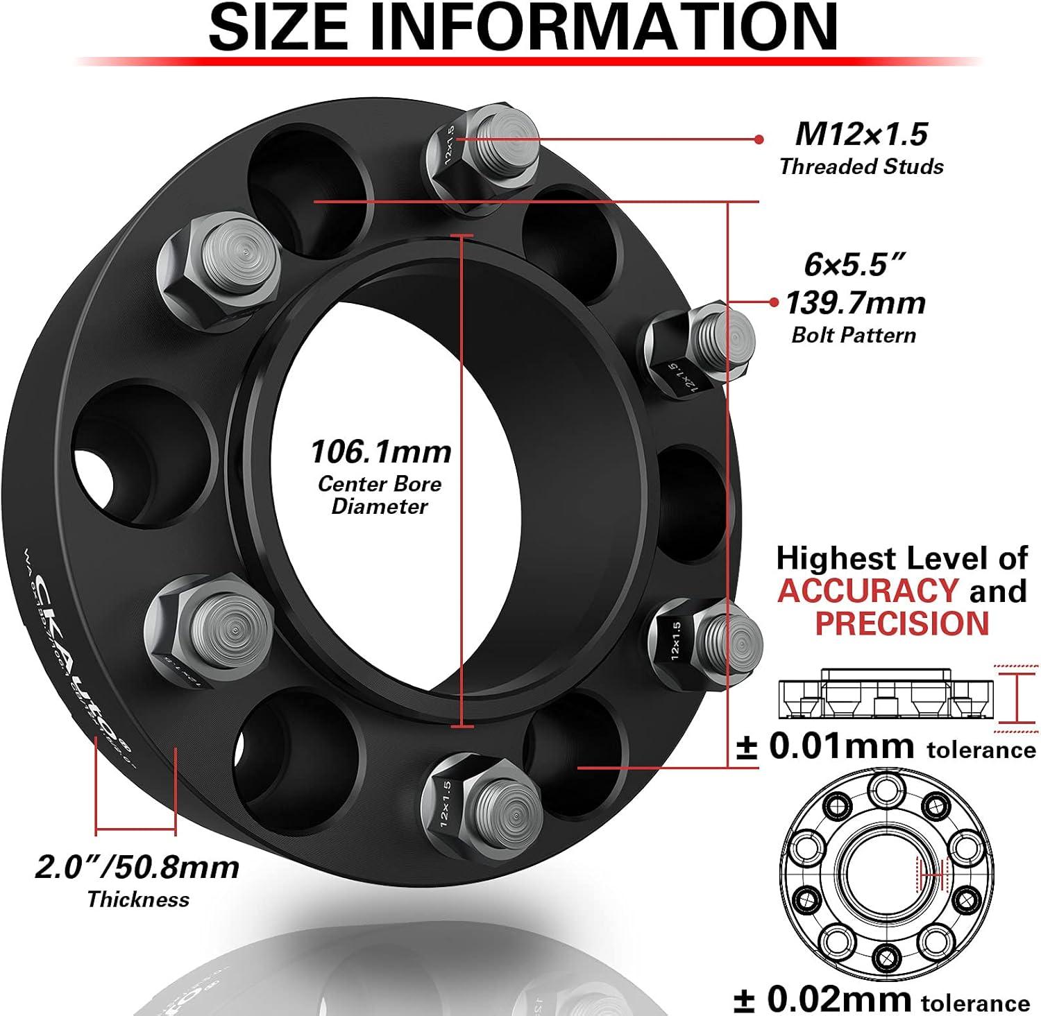 CKAuto 2 Pack 6×5.5 Hub Centric Wheel Spacers, 1.50″ 6×139.7mm Wheel Spacers, 106.1mm Center Bore with M12x1.5 Studs(2.00” Thick / 4 pack)